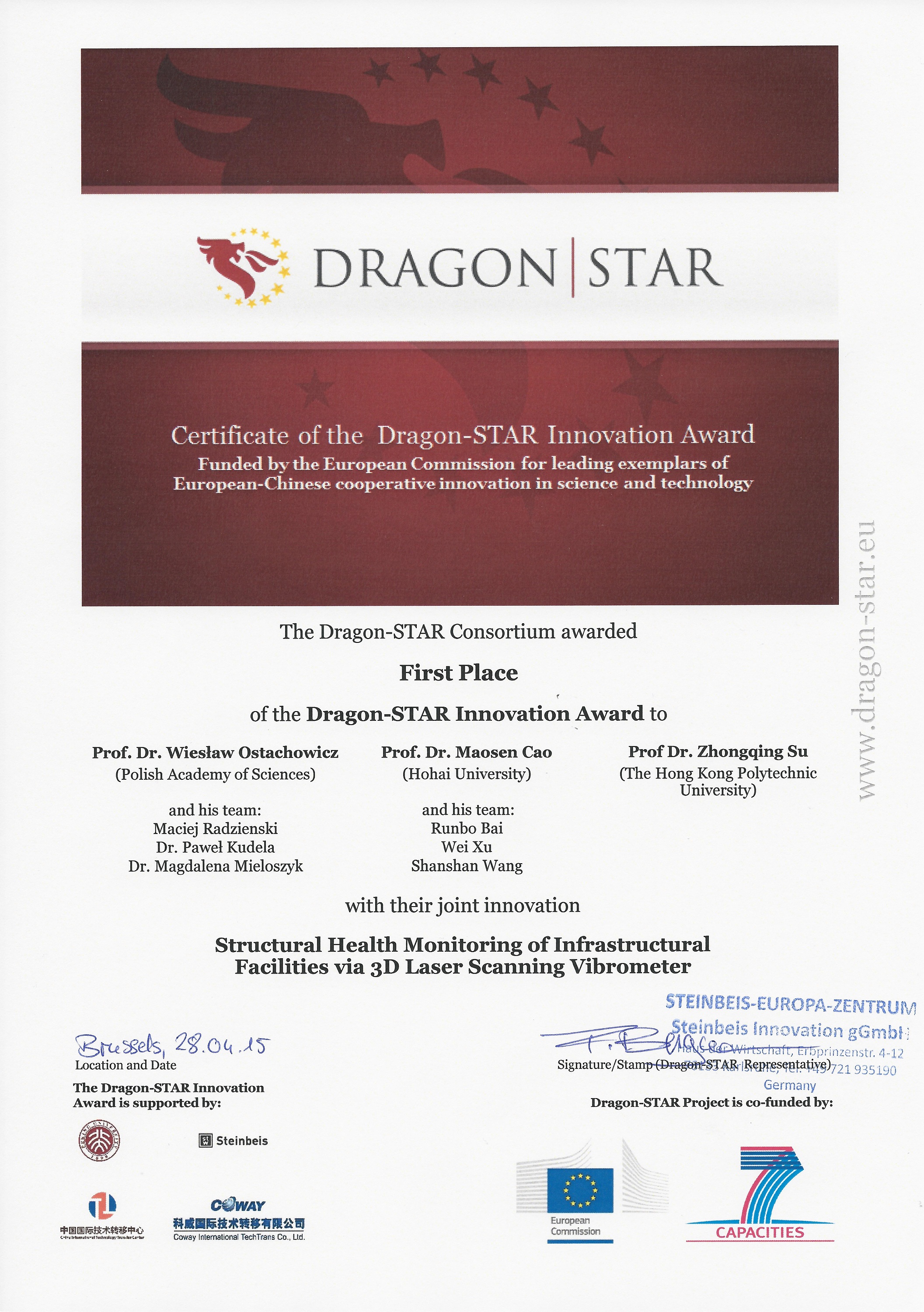 Professor Wiesław Ostachowicz with his team was awarded the 1st place in The Dragon-STAR Innovation Award.This prize is awarded for outstanding European-Chinese cooperation in research and innovation.