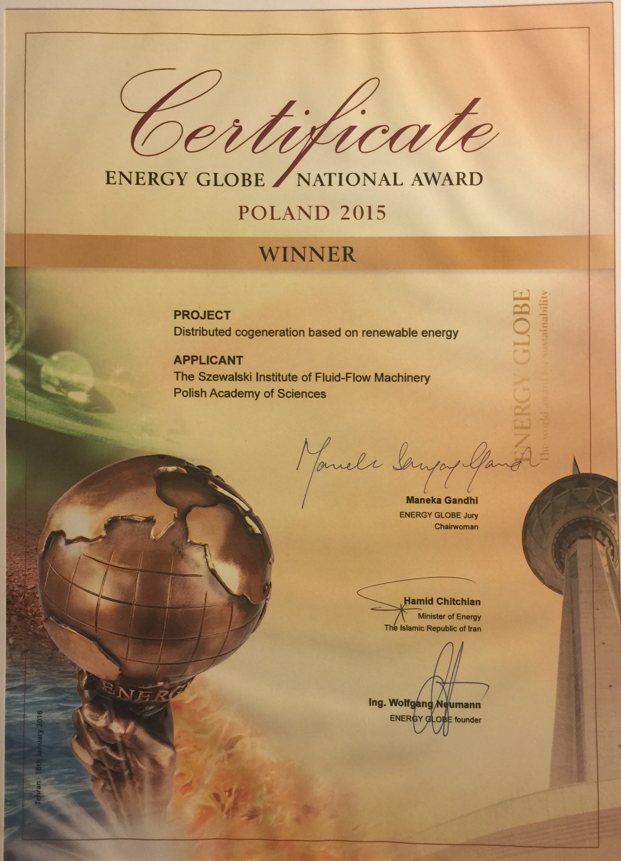 The Institute of Fluid-Flow Machinery of the Polish Academy of Sciences in Gdańsk was honoured with the Energy Globe National Award 2015 for the implementation and coordination of the national project No. POIG.01.01.02-00-016/08, entitled ‘Model agro-energy complexes ....’, as one of more than 1,500 top ecological projects from 177 countries worldwide.
