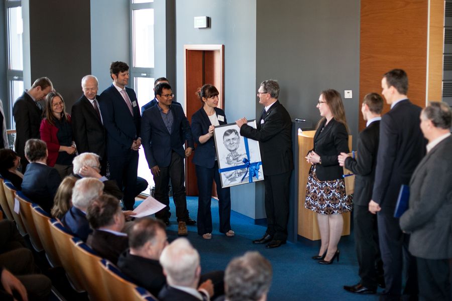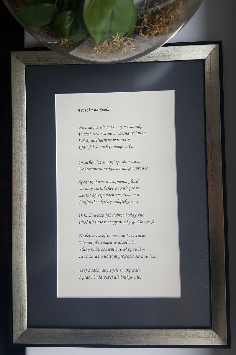 Then three of his pupils gave papers on scientific research conducted under his direction in the last decade. Prof. Wiesław Ostachowicz's scientific team presented a gift and a poem written specifically for this occasion entitled "Fraszka na Boss", by one of his pupils.