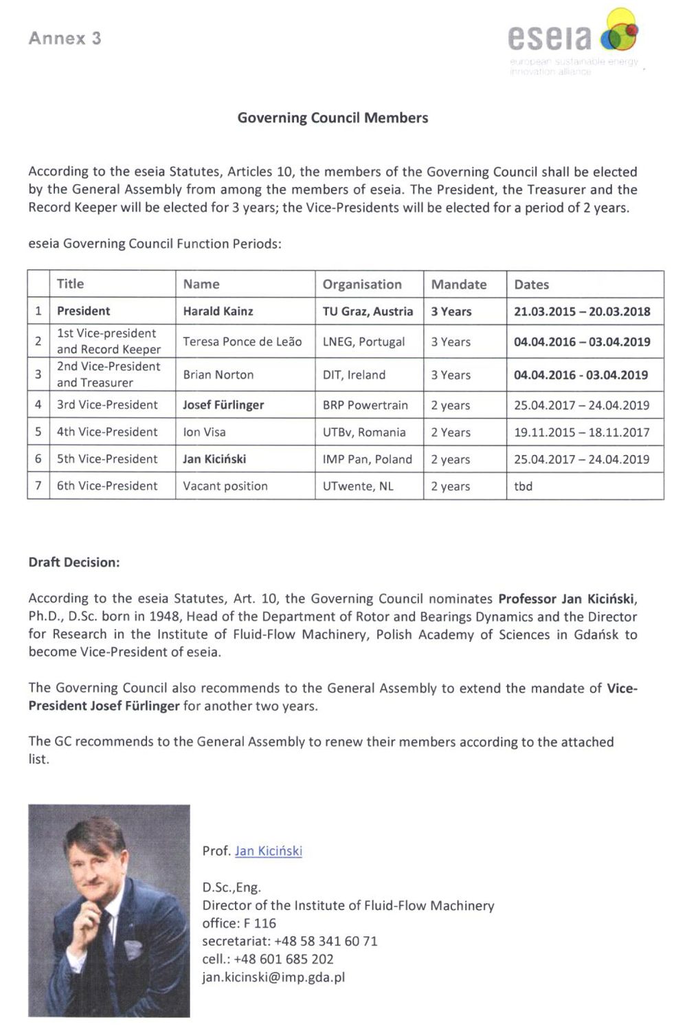 On 25.04.2017. Prof. dr hab. inż. Jan Kiciński, Director of Robert Szewalski PAS Flow Machine Institute, was nominated Vice-President of the European Sustainable Energy Innovation Alliance.