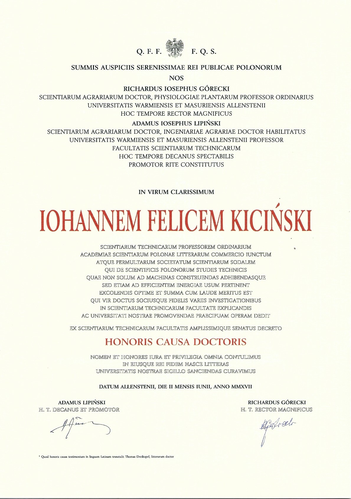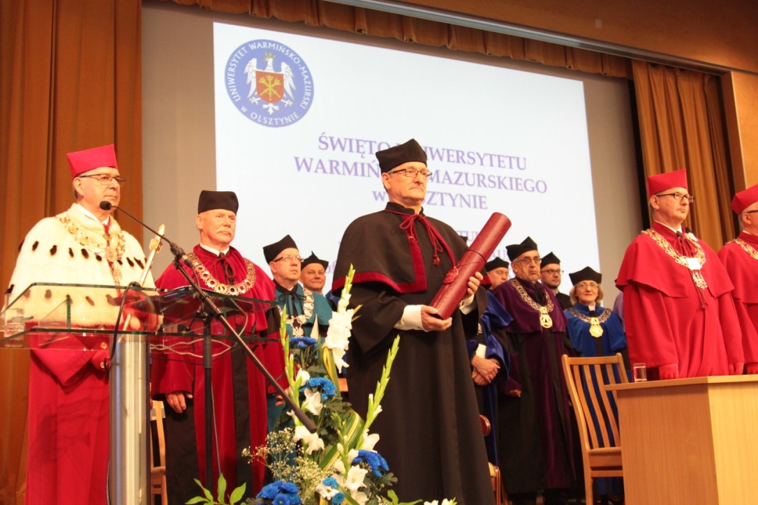 The Senate of the University awarded honorary doctorate to the Director of IMP PAS Professor Jan Kiciński for his significant contribution to the development of Polish science in the field of technical sciences, in particular in disciplines, the construction and operation of machinery and energy, and for scientific and research cooperation with the University of Warmia and Mazury in Olsztyn, for the promotion of the University and for supporting the development of the Faculty of Technical Sciences. The PhD is promoted by Dean of the Faculty of Technical Sciences of the University of Warsaw Dr Adam Lipiński, Prof. UWM.