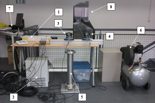 Figure 4. PIV flow test station: 1 - Double laser Nd:Yag , 2 - control unit, 3 - CCD 1, 4 - CCD 2, 5 - seed generator (solid particles), 6 - oil-free compressor for continuous operation, 7 - acquisition system