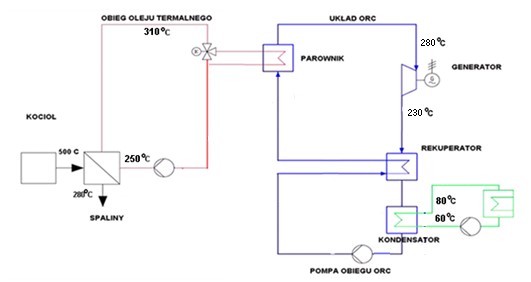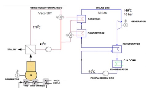 The system is a model of professional poligeneration unit for the production of electric energy, heat and cold for power range 0.1 – 1MWe. It utilizes available medium-temperature heat (at about 350oC). The system contains: