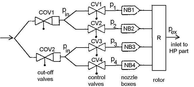 Partial admission is often used to control the power output in large power turbines. Steam flow is admitted through a number of nozzle boxes located at the annulus in the form of discrete arcs, and each nozzle box is equipped with a control valve. Each control valve has its own characteristics of opening. It has its own level of opening at a steady state, depending on the required turbine power. This type of power control requires the presence of a (usually one) control stage adapted to supply at partial-arc admission. Downstream, the control stage is followed by subsequent stages admitted at the full arc.