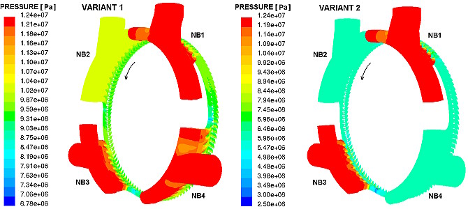 In this study two variants of operation of the investigated control stage are considered. They refer to two power outputs of the turbine: (1) 215 MW - nominal turbine conditions; (2) 140 MW - a certain low load operation at which the power output of the control stage itself reaches a maximum value.
