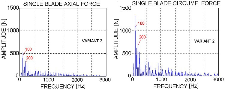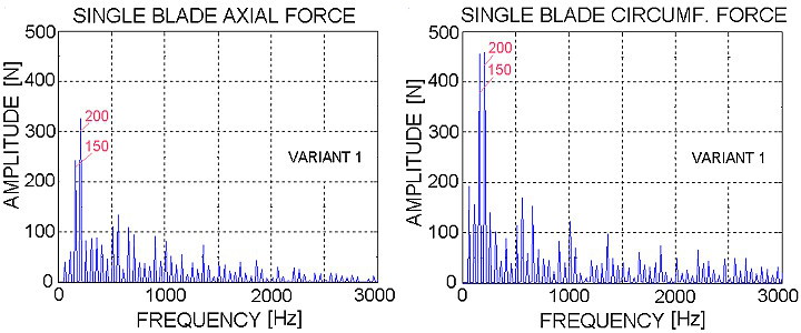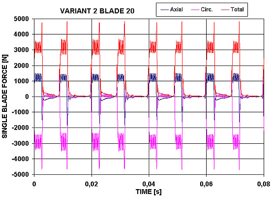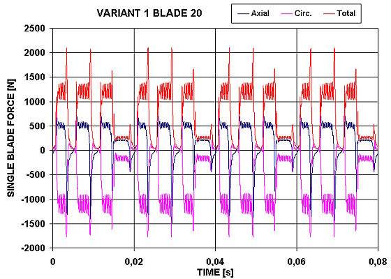 Transients of axial, circumferential and total force at the control stage rotor blade;