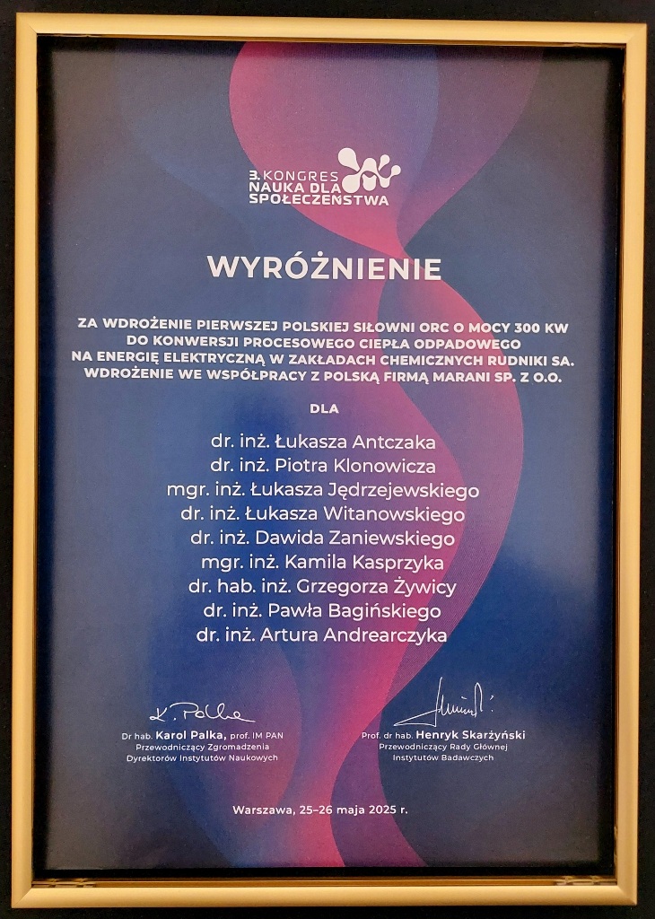 - Pierwsza polska siłownia ORC o mocy 300 kW do konwersji procesowego ciepła odpadowego na energię elektryczną (współpraca IMP PAN z firmą Marani)