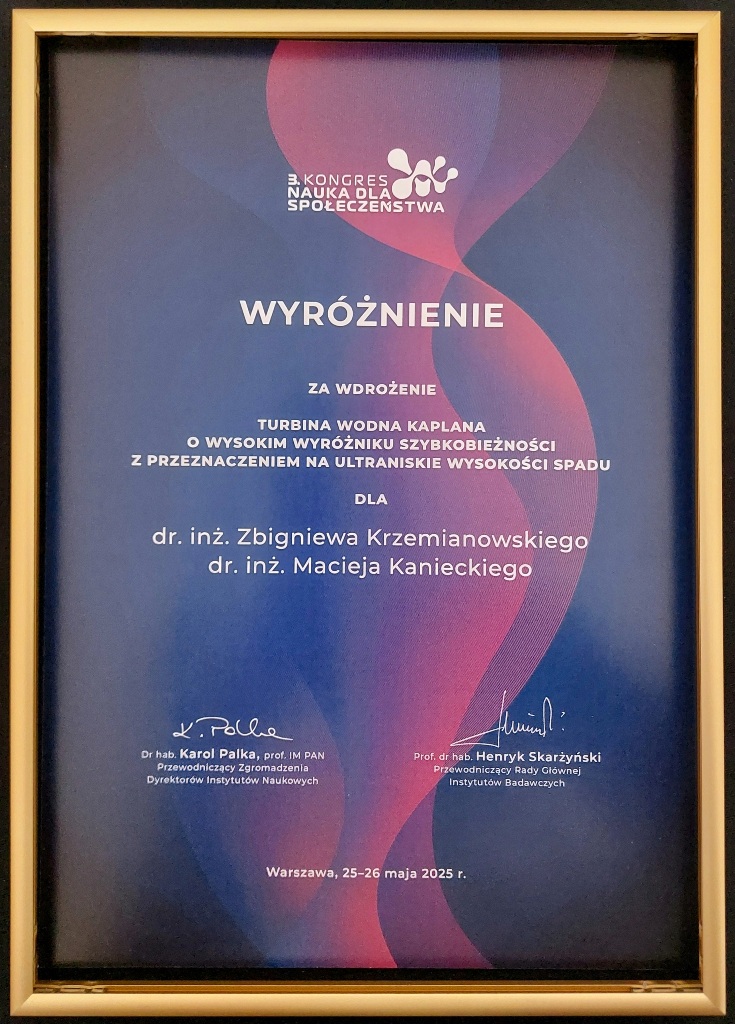 - Turbina wodna Kaplana o wysokim wyróżniku szybkobieżności z przeznaczeniem na ultraniskie wysokości spadu (współpraca IMP PAN z firmami TG-Dnalop i Thordon Bearings)