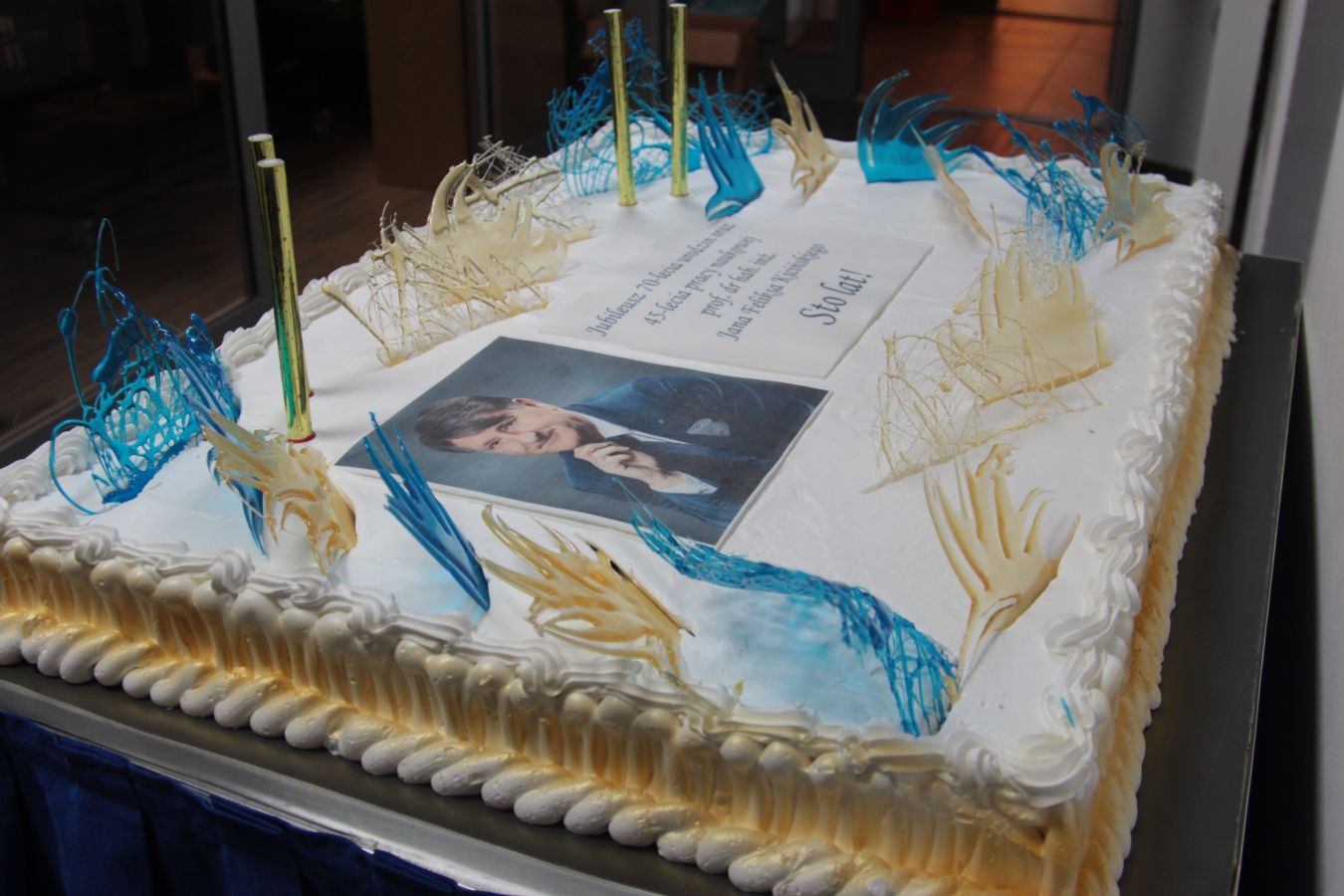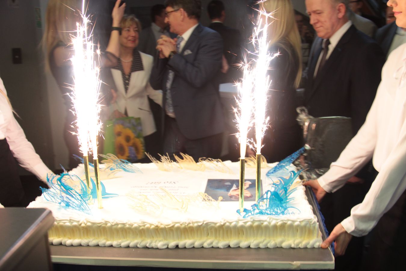 W czasie krótkiej przerwy Jubilat otrzymał olbrzymi tort urodzinowy - prezent od Załogi, a zebrani goście odśpiewali tradycyjne Sto lat.