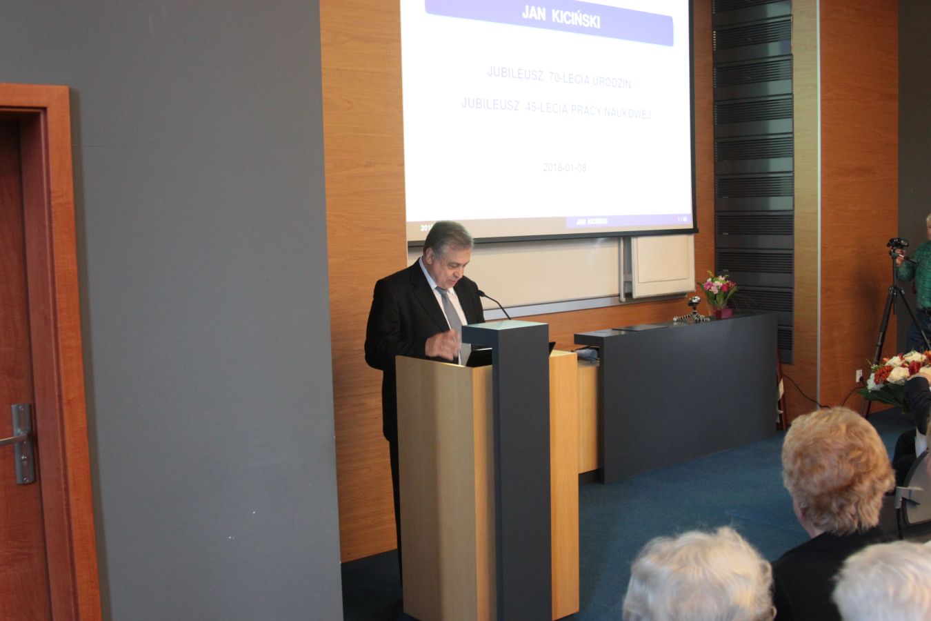 Przedstawienia sylwetki Jubilata podjął się prof. dr hab. inż. Wojciech Cholewa, a następnie prof. dr hab. inż. Jan Kiciński zaprezentował zebranym gościom: Moje 70 lat. Coś o sobie, coś dla innych. Następnie złożyli życzenia oraz wręczyli listy gratulacyjne i prezenty przybyli na uroczystość dostojni goście.