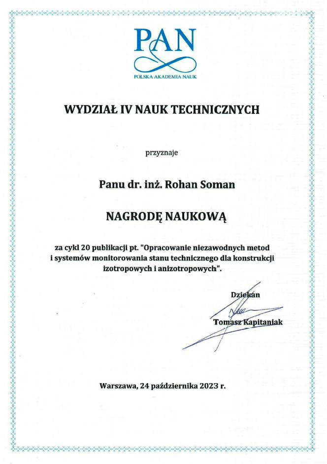 W dniu 13 grudnia 2023 r. w Warszawie odbyło się wręczenie nagród naukowych Wydziału IV Nauk Technicznych PAN. Jednym z laureatów tegorocznej nagrody jest pracownik Instytutu Maszyn Przepływowych PAN w Gdańsku dr inż. Rohan Soman, który jest adiunktem w Zakładzie Mechaniki Struktur Inteligentnych. Nagroda została przyznana za cykl 20 publikacji pod zbiorczym tytułem „Opracowanie niezawodnych metod i systemów monitorowania stanu technicznego dla konstrukcji izotropowych i anizotropowych”. W uroczystości wręczenia nagród uczestniczył Prezes Polskiej Akademii Nauk prof. Marek Konarzewski, a także Panie Wiceprezes prof. Natalia Sobczak i dr hab. Mirosława Ostrowska.