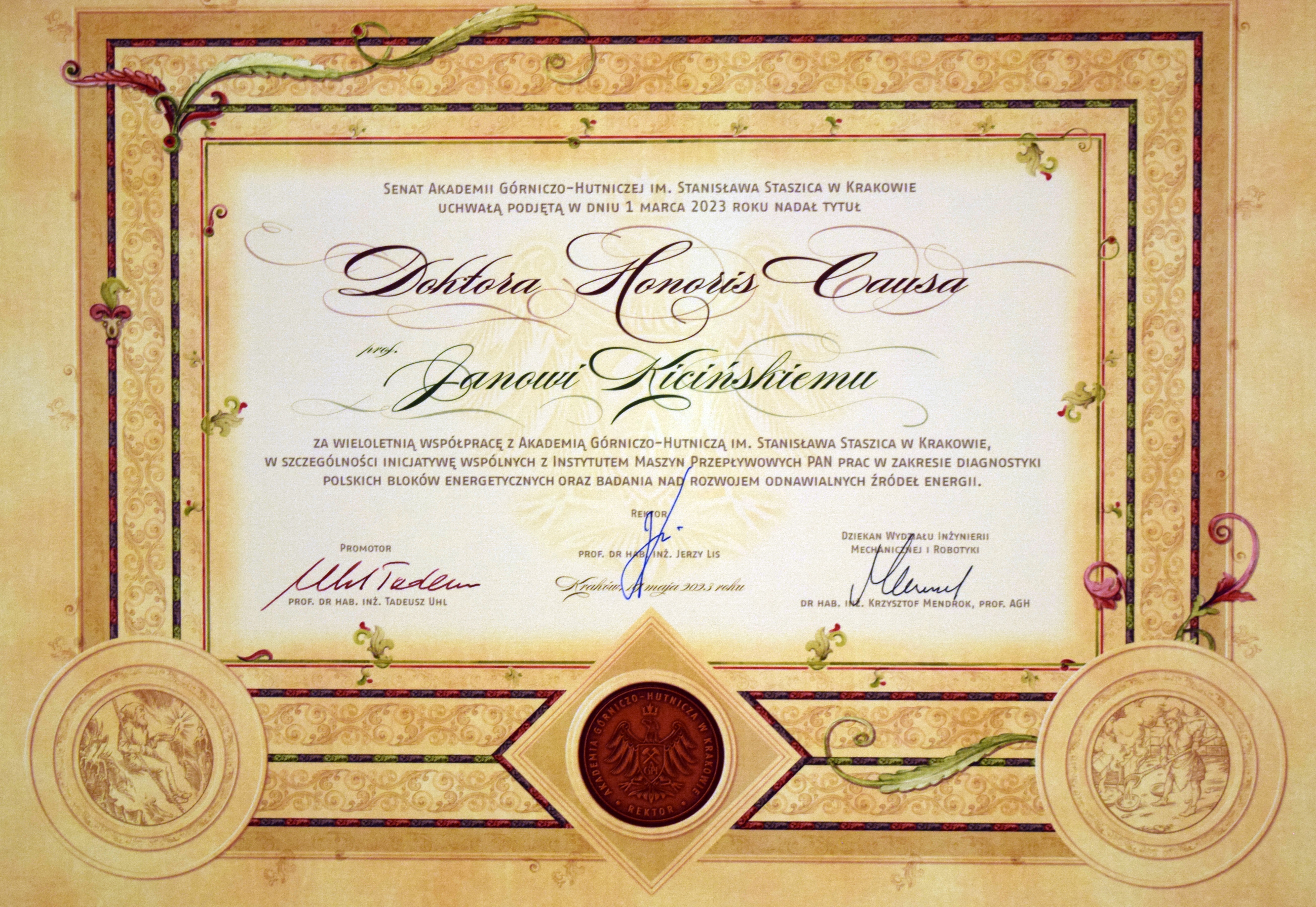 Postępowanie o nadanie tego tytułu rozpoczęło się 3 czerwca 2022 r. Kolegium Wydziału Inżynierii Mechanicznej i Robotyki pozytywnie zaopiniowało wniosek Dziekana WIMiR o wystąpienie w tej sprawie do Rektora i Senatu AGH, który 26 października 2022 r. podjął stosowną uchwałę. Na promotora wniosku wyznaczono prof. Tadeusza Uhla. Recenzentami zostali prof. Zbigniew Dąbrowski z Politechniki Warszawskiej oraz prof. Wojciech Cholewa z Politechniki Śląskiej. Uchwałą podjętą 1 marca 2023 r. Senat AGH nadał prof. dr. hab. inż. Janowi Kicińskiemu tytuł doktora honoris causa AGH za wieloletnią współpracę z Akademią Górniczo Hutniczą, w szczególności za inicjatywę wspólnych z Instytutem Maszyn Przepływowych PAN prac w zakresie diagnostyki polskich bloków energetycznych oraz badania nad rozwojem odnawialnych źródeł energii.