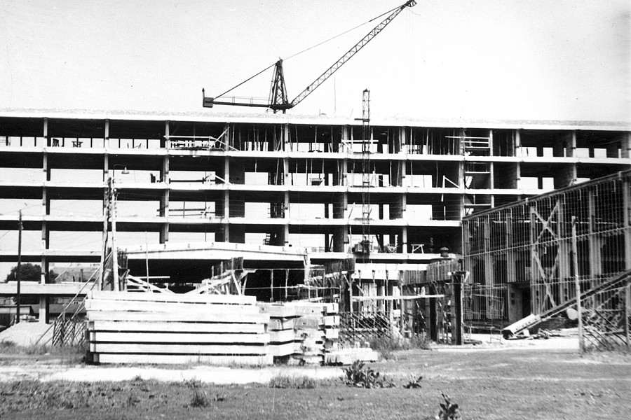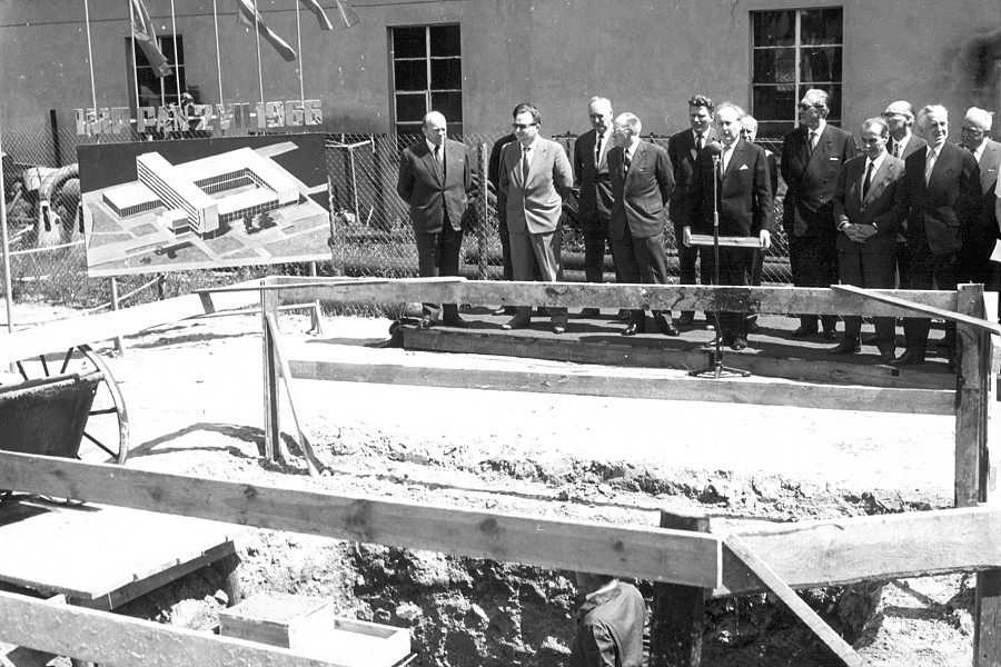 Dzięki wieloletnim staraniom i zabiegom założyciela i dyrektora Instytutu, prof. R. Szewalskiego, Instytut otrzymuje od władz Akademii zgodę i finanse na budowę nowego własnego gmachu. Jest to dowodem uznania dla działalności i osiągnięć całego zespołu pracowniczego placówki ze strony władz Akademii. Politechnika Gdańska odstępuje Instytutowi działkę budowlaną przy ul. J. Fiszera we Wrzeszczu. Dzięki zgodnemu wysiłkowi kierownictwa i załogi, opracowane zostają szczegółowe założenia budowy, a w roku 1966, w dziesięciolecie powołania Instytutu, Prezes Polskiej Akademii Nauk, prof. Janusz Groszkowski, w ramach pięknej uroczystości, kładzie kamień węgielny pod budowę gmachu.