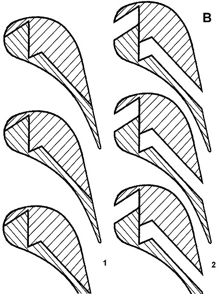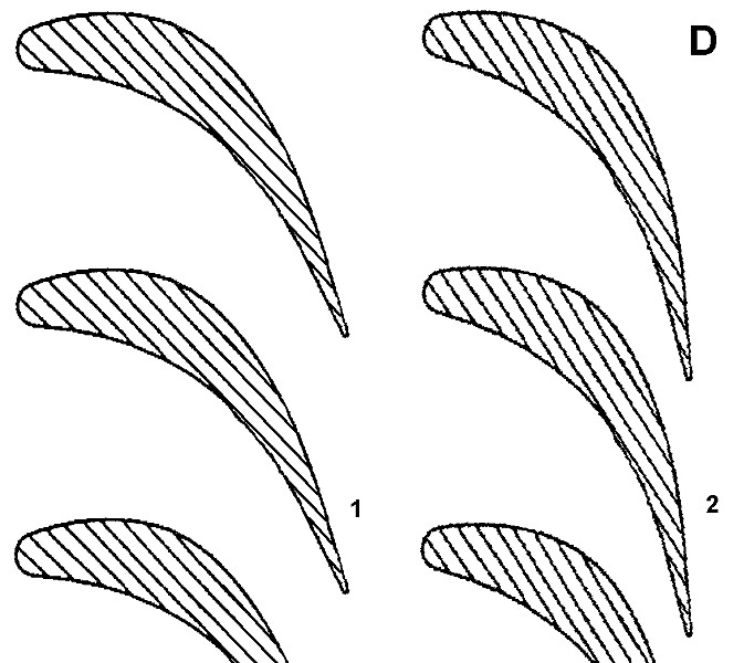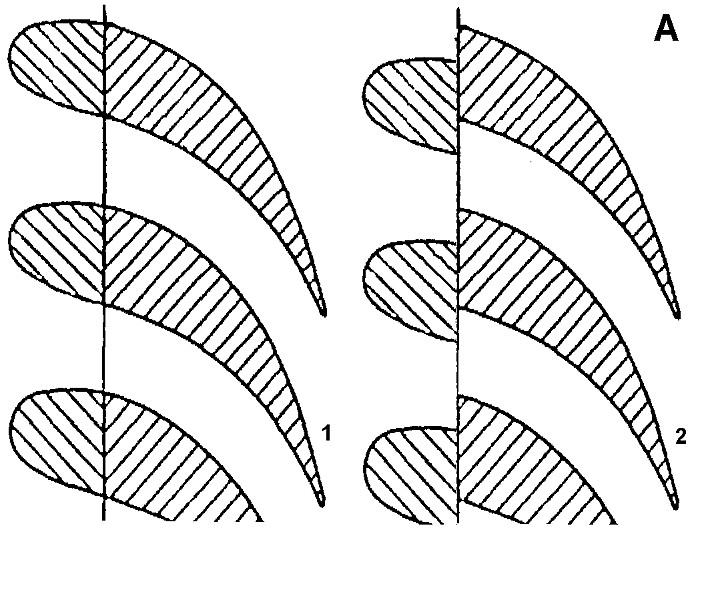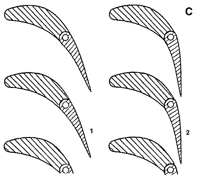Przykłady kierownic stopnia adaptacyjnego: łopatka z przestawną krawędzią wlotową (A), łopatka ze złożoną linią podziału (B), łopatka z obracaną krawędzią wylotową – lotką (C), obracana łopatka (D); 1 – pełne otwarcie kanału, 2 – otwarcie częściowe