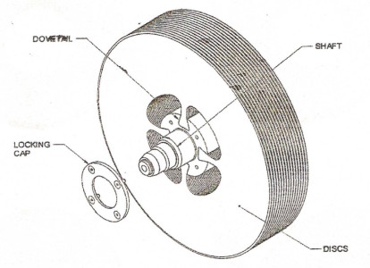 Turbina Tesli składa się z kilku (kilkunastu) cienkich tarcz zamocowanych na wale. Siłą napędową turbiny jest przepływ czynnika w przestrzeni międzytarczowej. Zasilanie ma miejsce przeważnie z kilku dysz ulokowanych dyskretnie na obwodzie, a wypływ czynnika odbywa się przez otwory w tarczy ukazane na rysunku.
