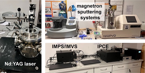 - c) układu IMPS/IMVS (intensity modulated photocurrent/voltage spectroscopy, Instytut Fotonowy) przeznaczonego do pomiarów: czasów życia (rekombinacji) nośników mniejszościowych, czasów transportu nośników przez próbkę, stałej dyfuzji próbki, długości dyfuzji nośników (jeśli znana jest grubość próbki), grubości próbki (jeśli znana jest stała dyfuzji), szybkości transferu ładunków przez interfejsy i innych wielkości dynamicznych.